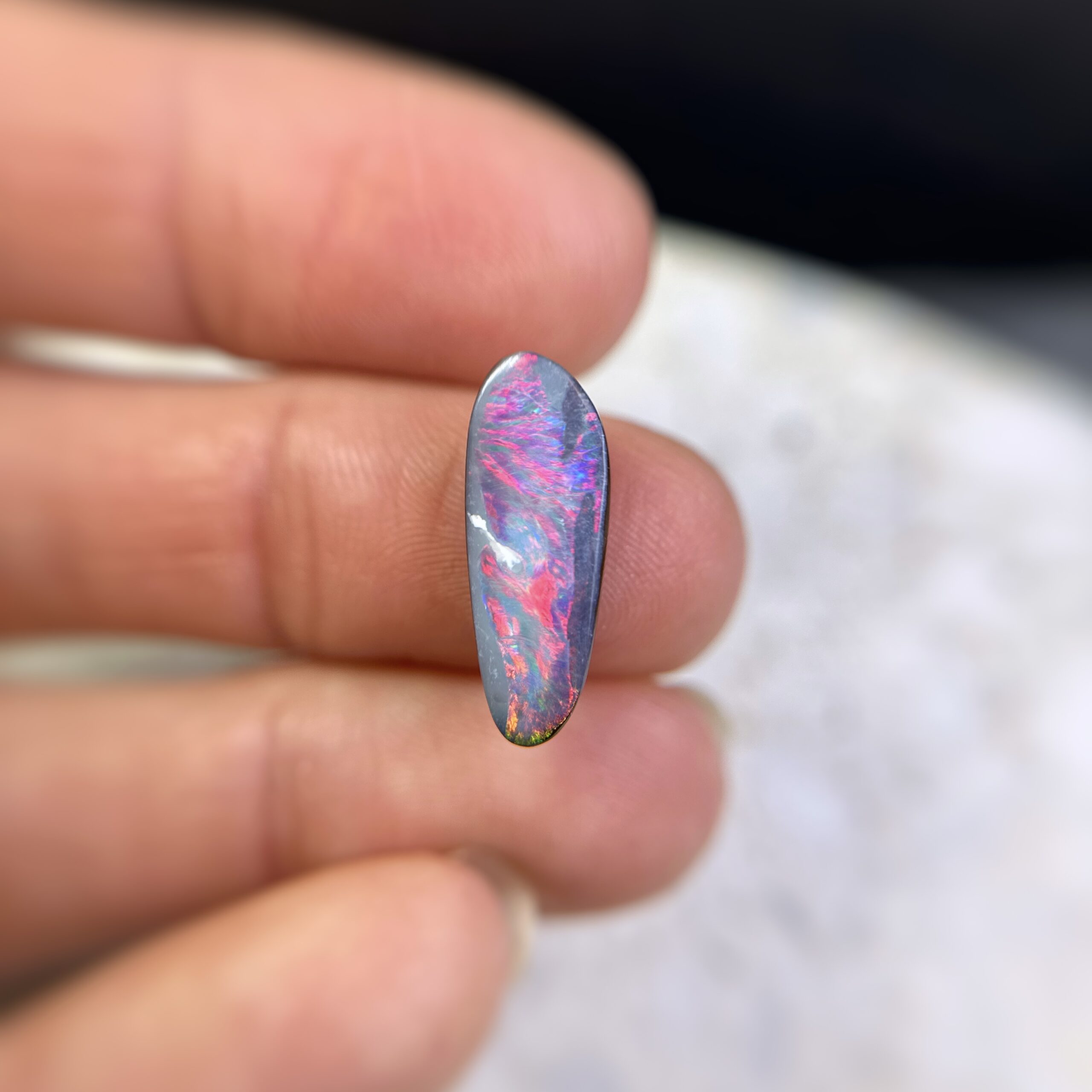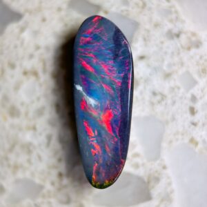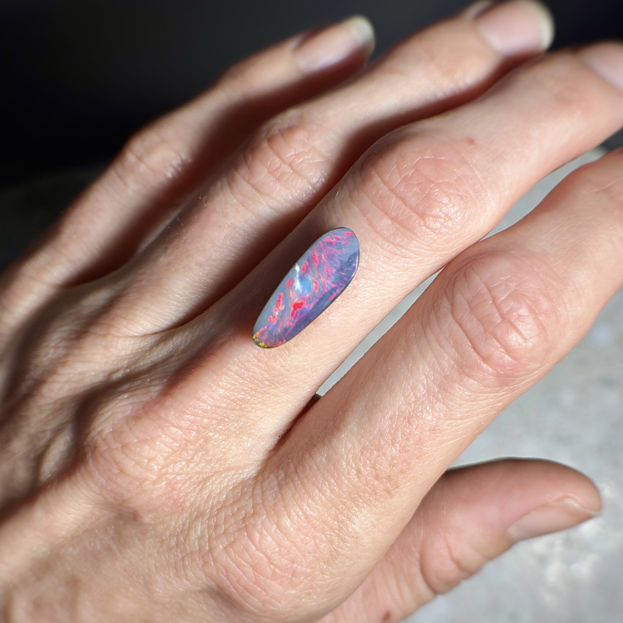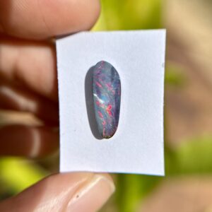 Typically we reserve the name ‘Chameleon’ opal for our pieces that change in colour when when moved around in different lightning. However the name feels right for this piece also. Do you prefer a prominent pop of red/pink or blue/green, you get the best of both worlds with opal all by turning it around