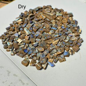 -The opals are shown wet & dry; dry is their current state which shows the opals rough condition, this allows you to see what work is needed. Wet shows you the opals potential when cut & polished