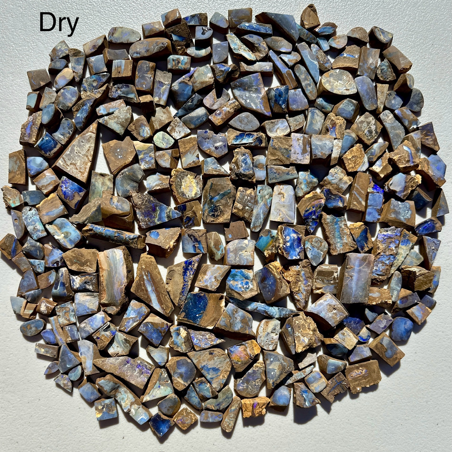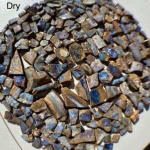 -The opals are shown wet & dry; dry is their current state which shows the opals rough condition, this allows you to see what work is needed. Wet shows you the opals potential when cut & polished