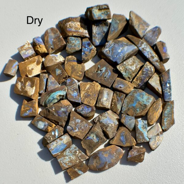 -The opals are shown wet & dry; dry is their current state which shows the opals rough condition, this allows you to see what work is needed. Wet shows you the opals potential when cut & polished