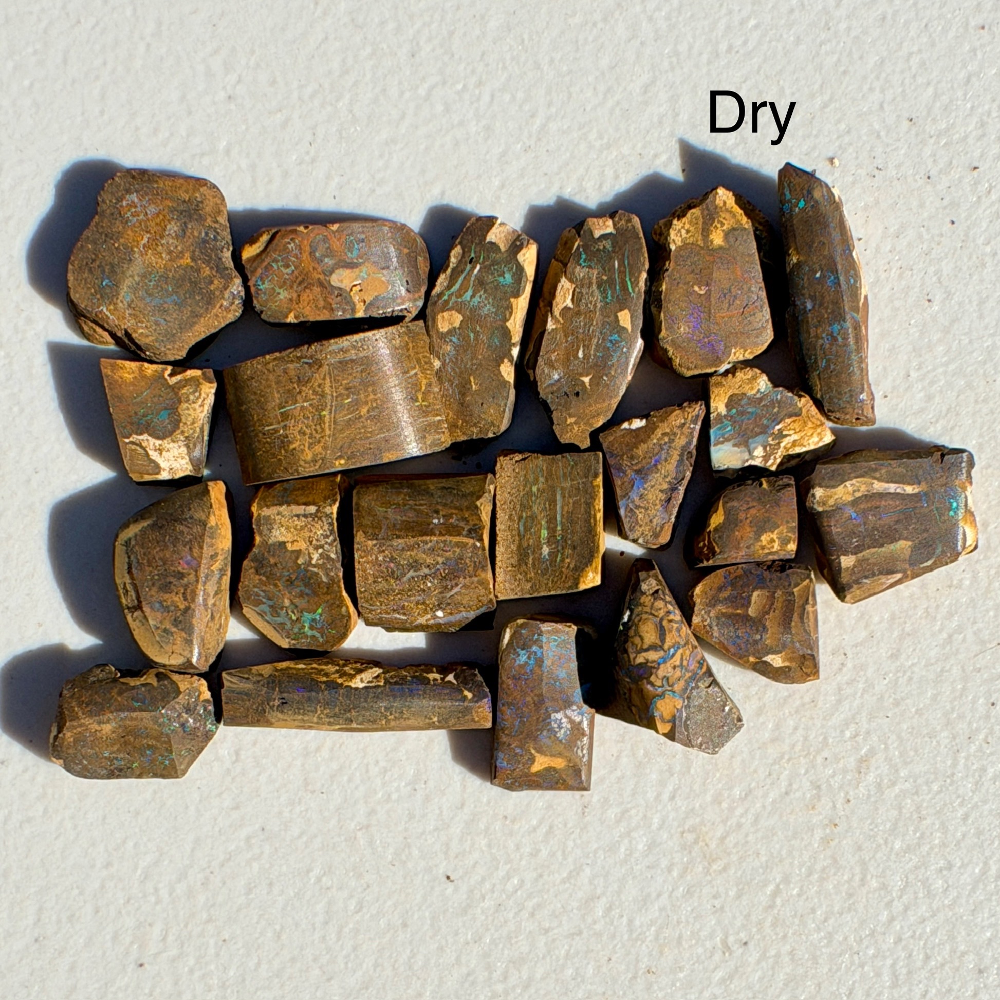 -The opals are shown wet & dry; dry is their current state which shows the opals rough condition, this allows you to see what work is needed. Wet shows you the opals potential when cut & polished